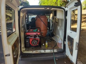 No carro foi adaptado um tambor de 200 litros para água, um gerador de energia e uma lavadora de alta pressão, além de materiais e produtos de limpeza.
