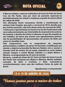 O empresário Edson Marrero, organizador do rodeio de Santa Cruz do Rio Pardo, confirmou nesta segunda-feira (15), algumas alterações na grade de shows para a festa de 2020.